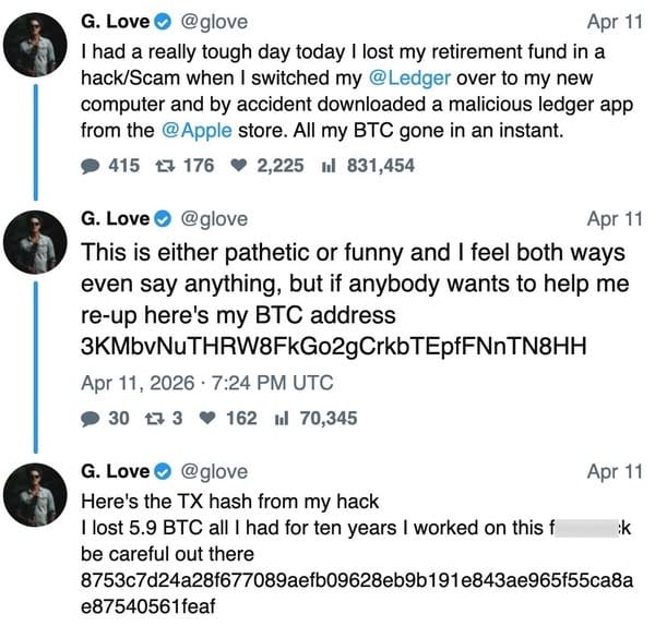 In what must have been a painful admission earlier this month, G. Love described how while setting up a new computer, he downloaded what he believed was the legitimate Ledger Live app from Apple's official App Store.